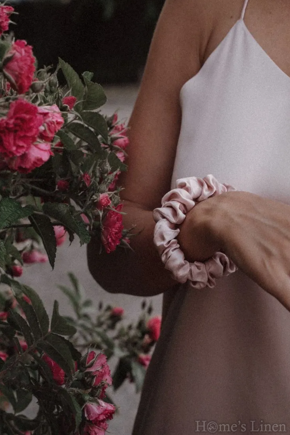 Ластикът е изработен от 100% естествена коприна, чиито фибри съдържат аминокиселини със структура, подобна на тази на човешкия косъм. По тази причина, изделията от естествена коприна имат редица ползи за косата - щадят косъма и по-малко начупват косата. Едноцветния дизайн подхожда на повечето летни тоалети. Ластикът е в модерн стил скрънчи.
