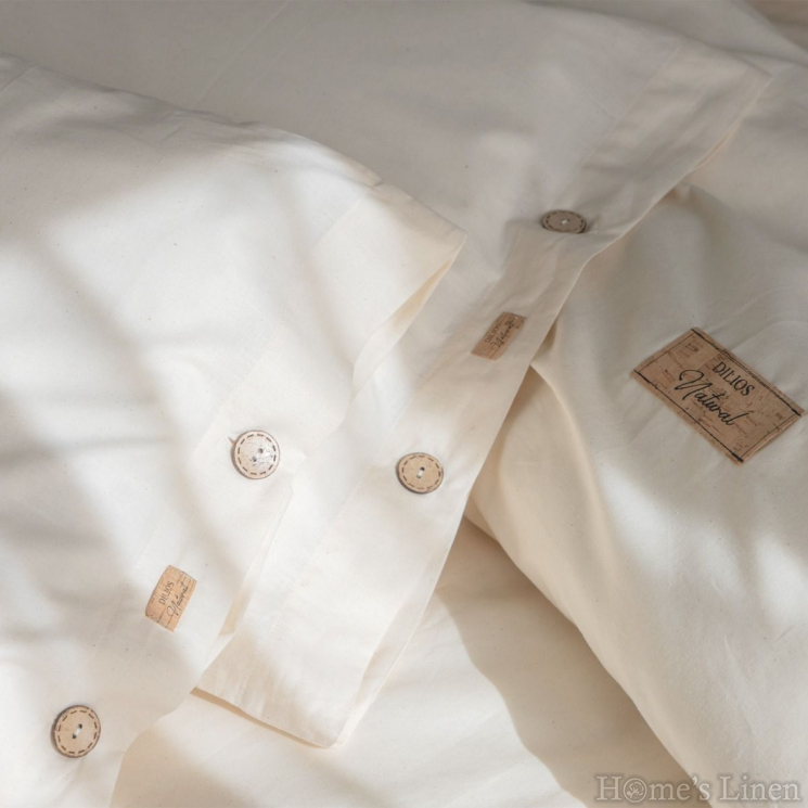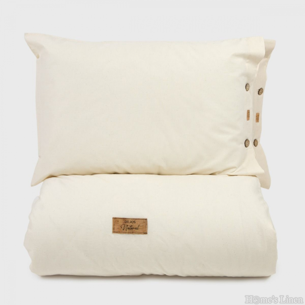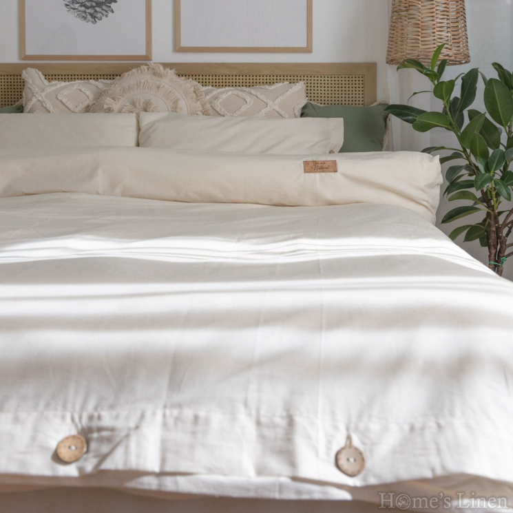 Изработен от висококачествен натурален памук, този комплект се отличава с 100% естествен памук изтъкан с грижа и предложен с естествения си цвят на суров памук без химично избелване и оцветяване, устойчив на избледняване за дълготрайна красота. Натуралният плат е материя с естествен натурален цвят на сурова памучна тъкан със структура Ранфорс 57 нишки см2, при обработката на която е използвано по-малко количество вода. Платът с естествен вид е изпран със сапун и след това меко каландриран (омекотен) в последния етап, без да се прилагат избелващи химикали, за да запази естественият си вид.
